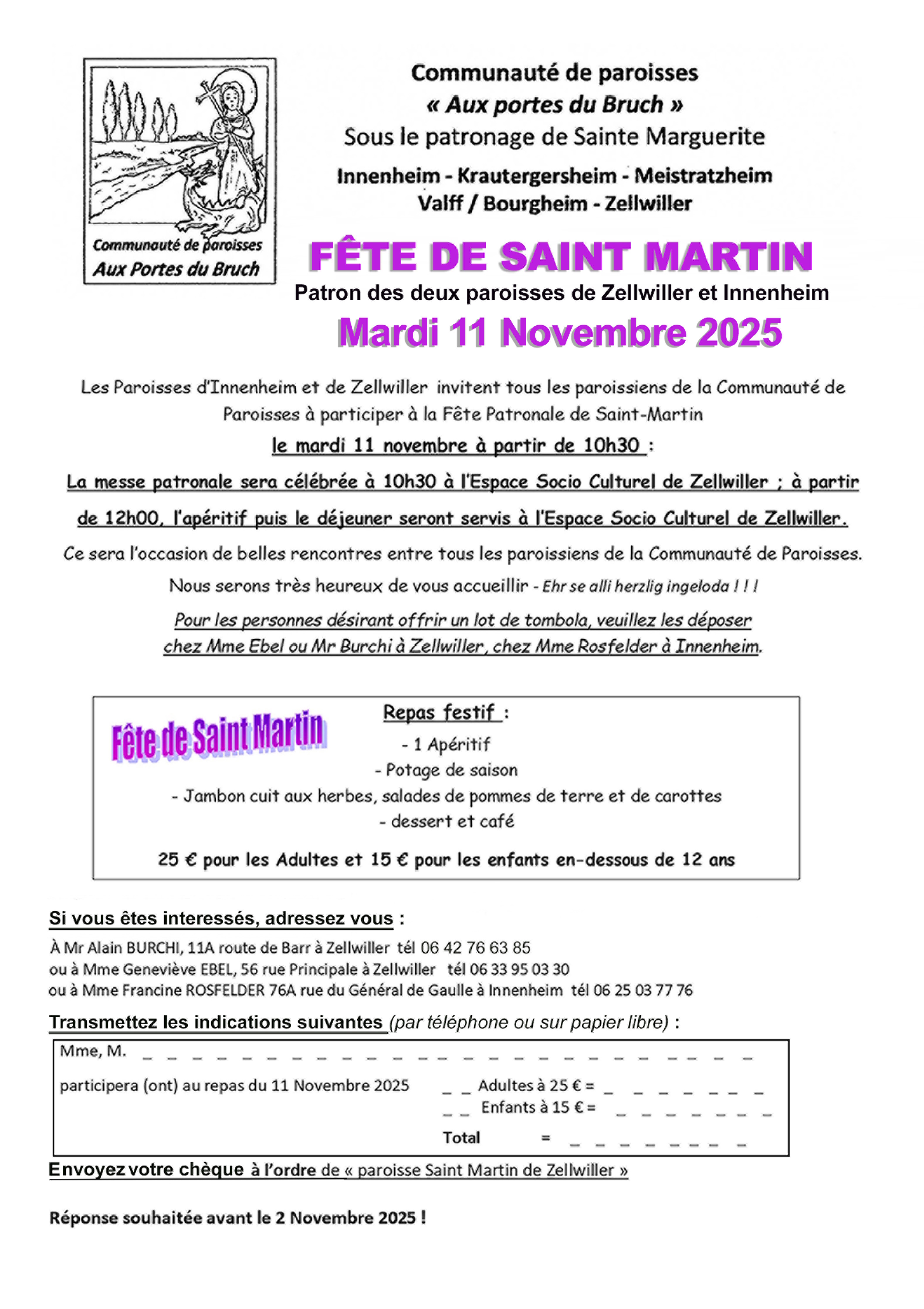 La Communauté de Paroisses "Aux portes du Bruch" sous le patronage de Sainte Marguerite (Innenheim, Krautergersheim, Meistratzheim, Valff, Bourgheim, Zellwiller) vous invite à la