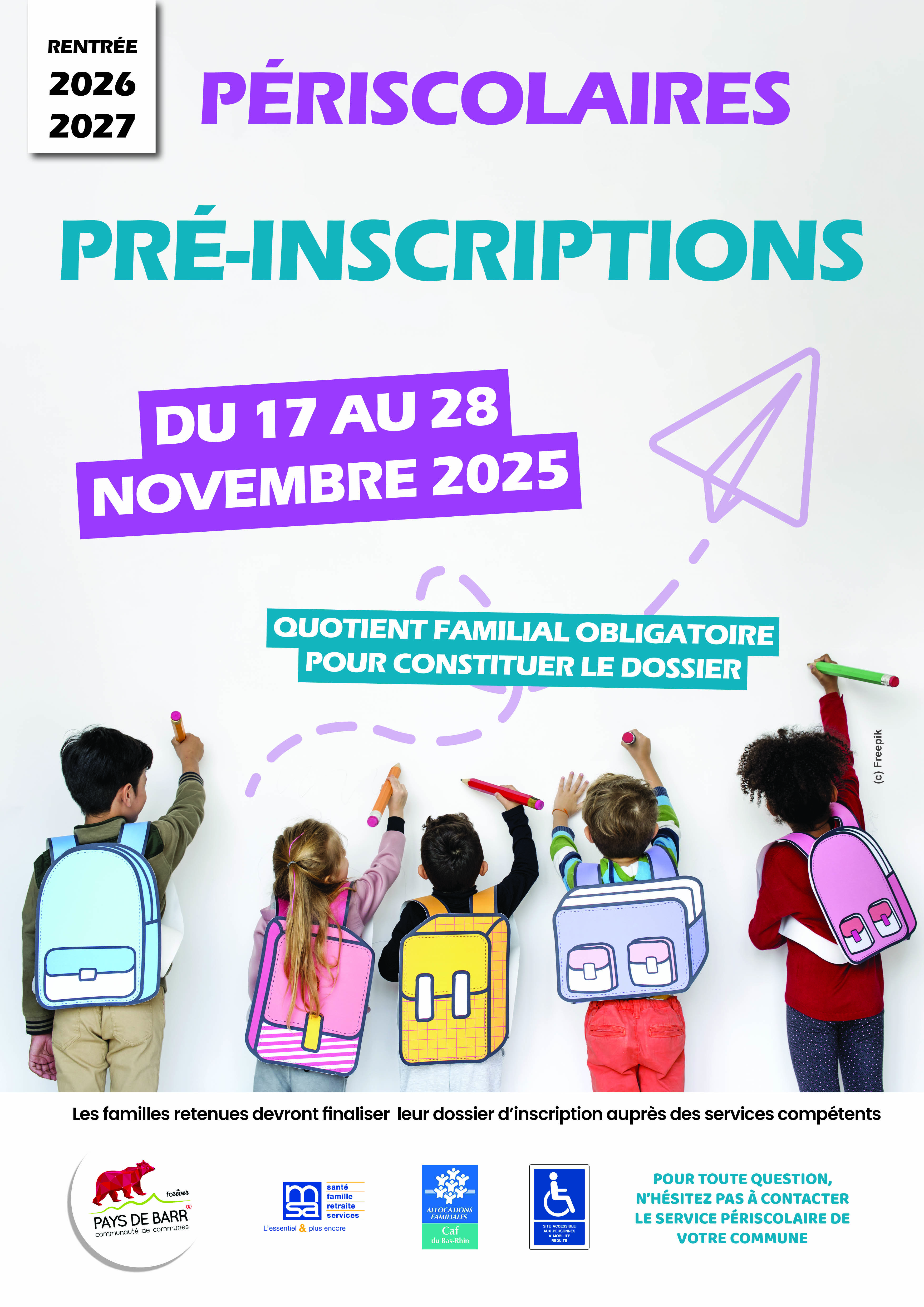 La communauté de communes et son délégataire AGF lance sa campagne de pré-inscription pour l’accueil périscolaire rentrée 2026/2027, qui se déroulera du 17 au 28 novembre 2025.