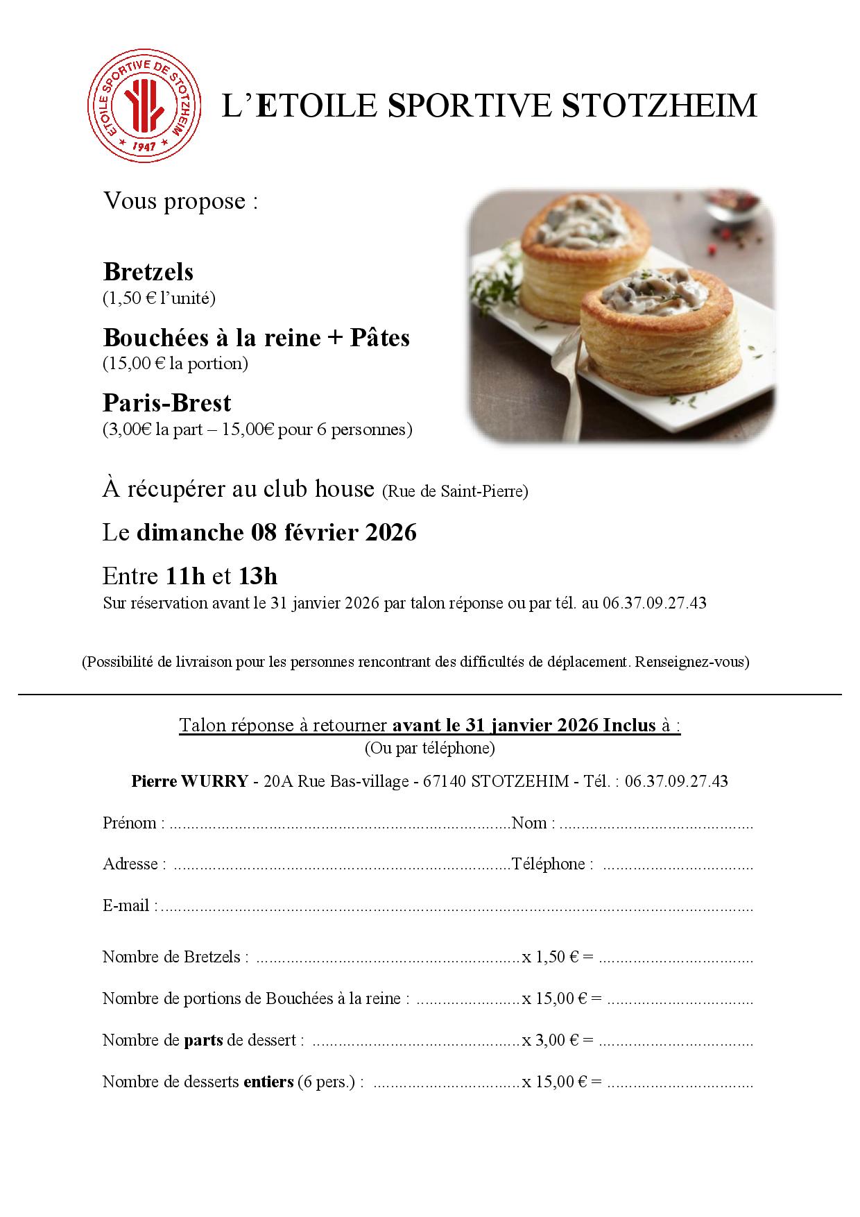 L'E.S.STOTZHEIM organise au club house le dimanche 08 Février entre 11h00 et 13h00 une vente de Bouchée à la reine à emporter ou livré à domicile ( Possibilité de livraison pour les personnes habitant à Stotzheim et ayant des difficultés de déplacement. (Se renseigner au moment de la réservation) .