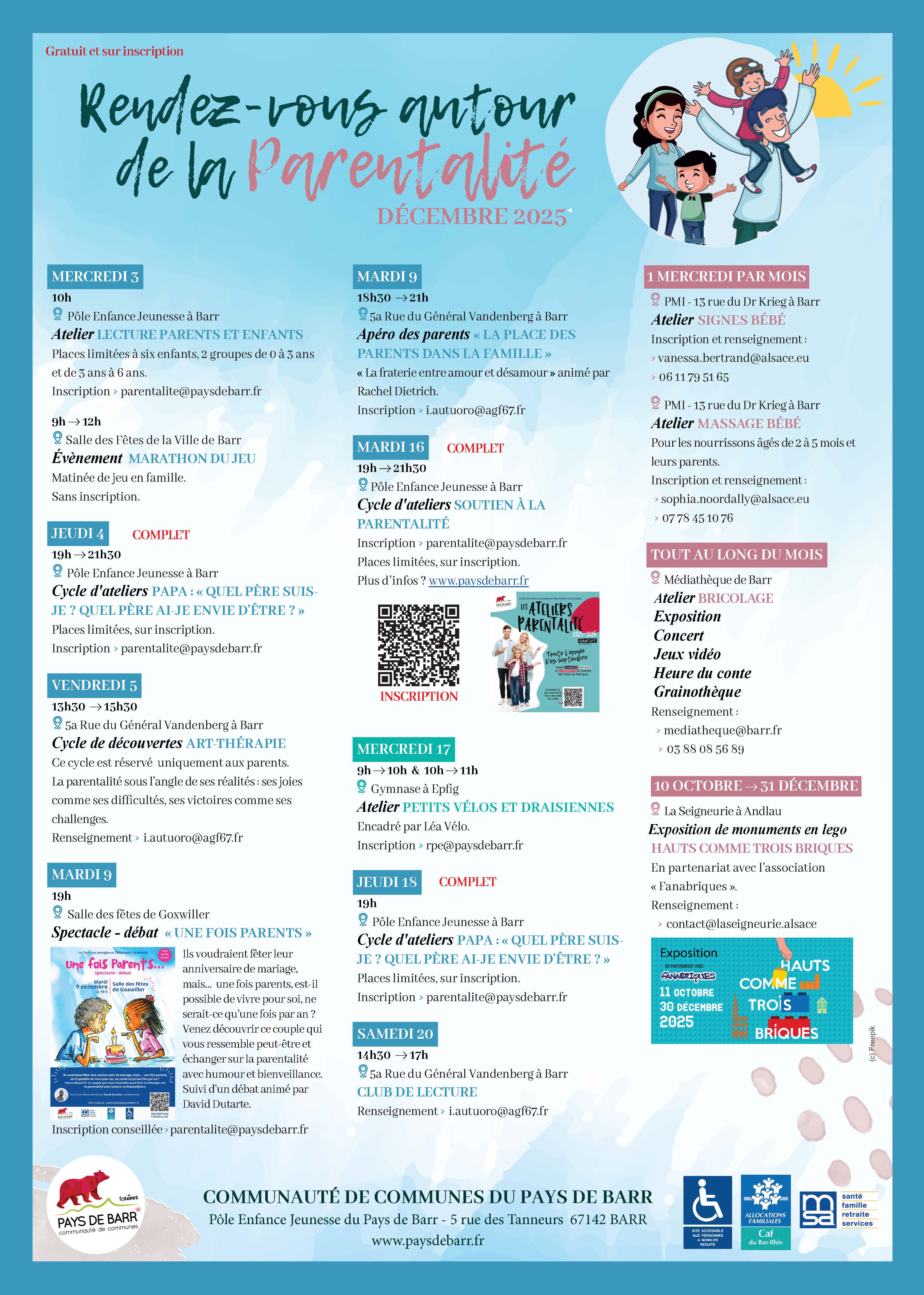 Inscription aux ateliers parentalité par mail à parentalite@paysdebarr.fr ou en cliquant sur le lien ci-dessous :