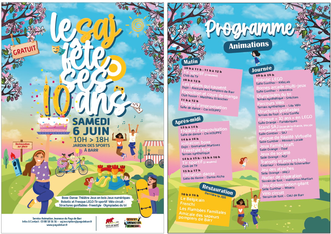 Une décennie d’engagement célébrée à l’occasion d’un événement riche et festif. Pour marquer cet anniversaire, le SAJ du Pays de Barr vous invite à une journée conviviale et pleine de surprises !